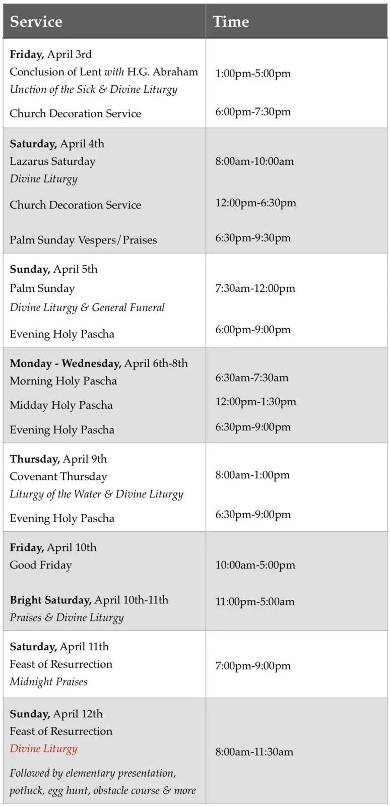 6:30pm – 7pm Adults Hymns Class: Saturday nights7pm – 7:30pm Vespers: Saturday nights